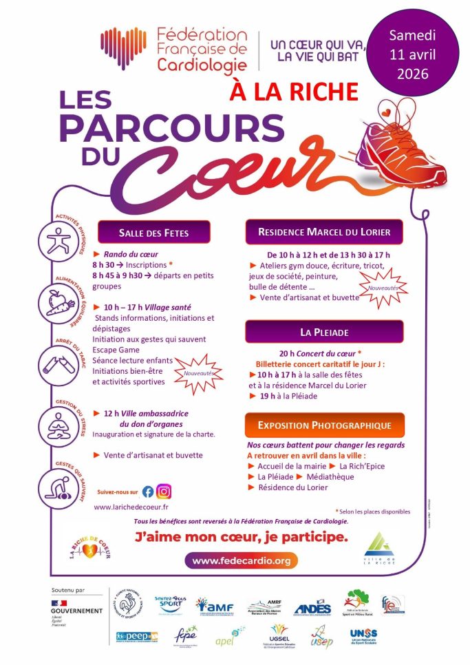 - Atelier yoga parents- enfants en partenariat avec l‘association la Riche de Cœur à l’occasion des Parcours du cœur. Samedi 5 avril 2024 de 15h00 à 16h00, centre social Equinoxe, La Riche (Participation au profit de la Fédération française de cardiologie)