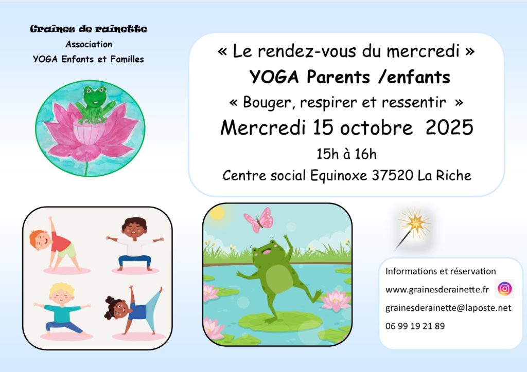 - Rendez-vous yoga parents enfants du mercredi , mercredi 15 octobre 2025 de 15h à 16h au Centre social Equinoxe suivi d’un goûter et de l’AG de l’association. COMPLET (possibilité de s’inscrire sur liste d’attente si désistement)