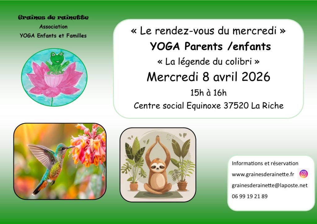 - Samedi 7 février à 10h ou 11h : Yoga parents / enfants sur les Emotions organisé en partenariat avec le Centre social Jules Verne de Ballan-Miré dans le cadre de la parentalité.