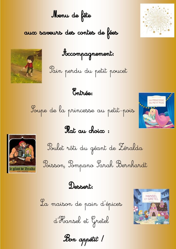 Un menu de fête pour célébrer la nouvelle année aux saveurs des contes de fée. Pain du petit poucet, soupe de la princesse au petit pois, poulet rôti du géant de Zéralda et pain d’épice d’Hansel et Gretel ! De quoi ravir les papilles et notre imaginaire ! Des contes à dévorer. Quel a été ton plat préféré ou plutôt ton conte préféré ? 😉